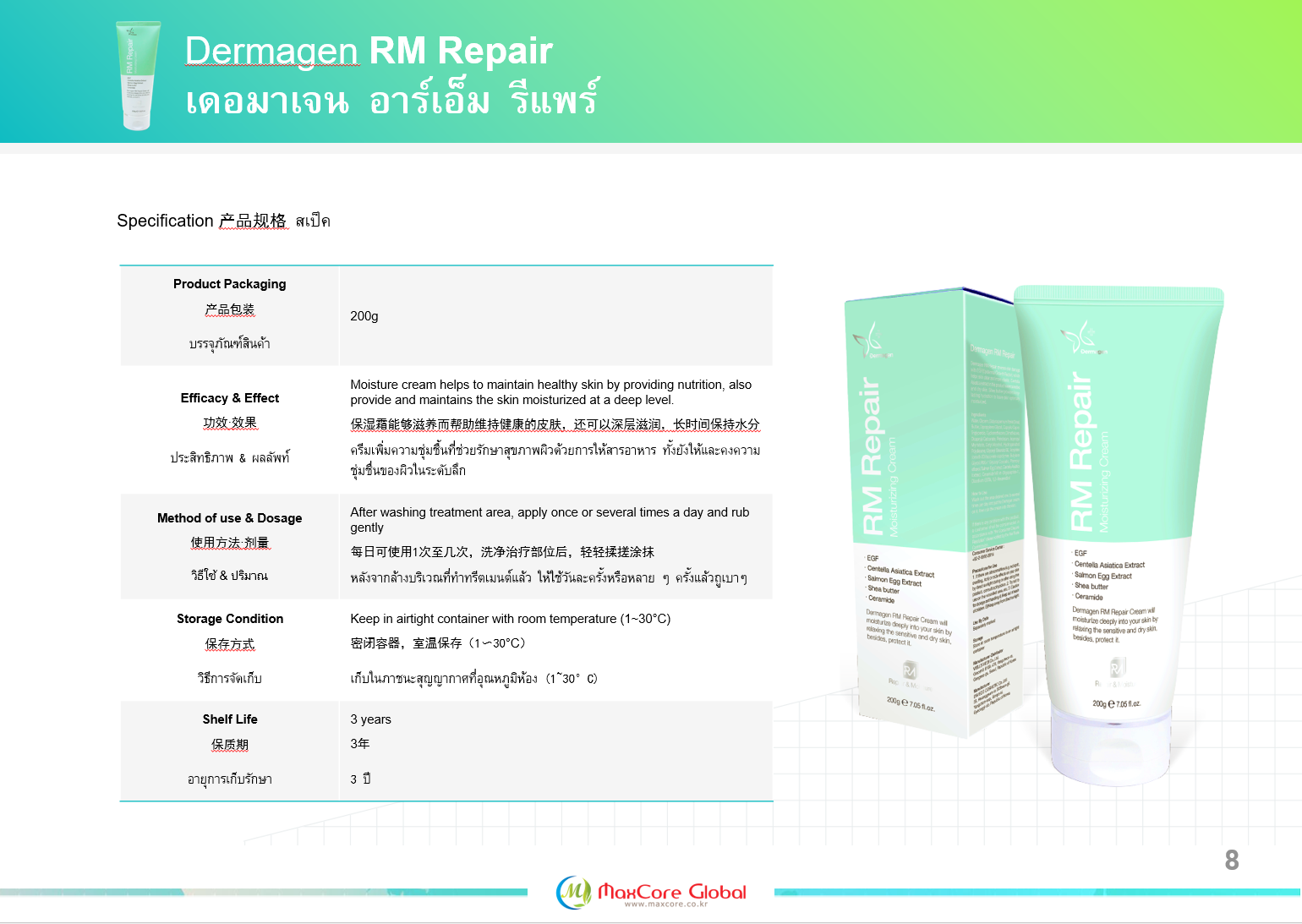 Efficacy : Dermagen RM Repair reverses skin damage with EGF (Epidermal Growth Factor), which helps skin clear and more elastic. Centella Asiatica extract in this product aeses sensitive and dry skin. Shea butter provides long-lasting hydration to leave skin optimally moisturized.