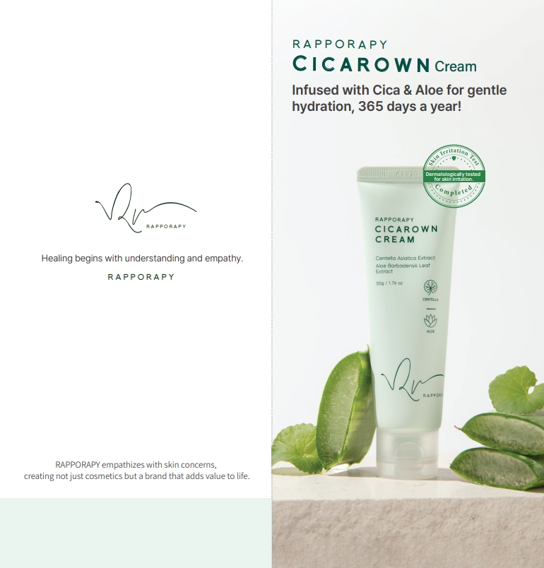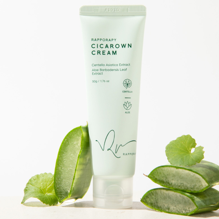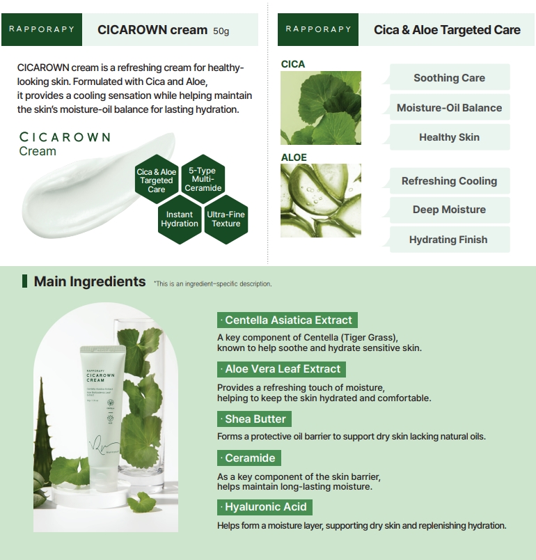 CICAROWN cream is a refreshing cream for healthy-looking skin. Formulated with Cica and Aloe, it provides a cooling sensation while helping maintain the ski's moisture-oil balance for lasting hydration.